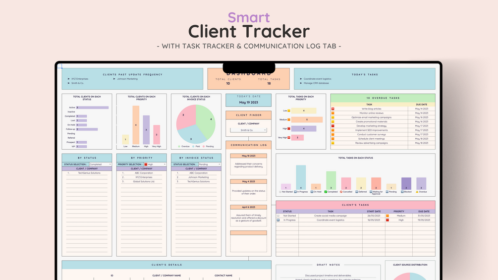 Take control of your client relationships with the Smart Client Tracker Template for Google Sheets and Excel. Designed for small businesses, this all-in-one tool helps you manage client details, track tasks, and log communications effortlessly. Streamline your operations and provide exceptional service with ease.