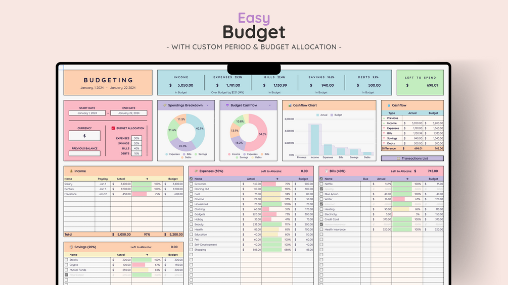 - Intelligent Budget Allocation: Allocate income effectively across custom categories.
