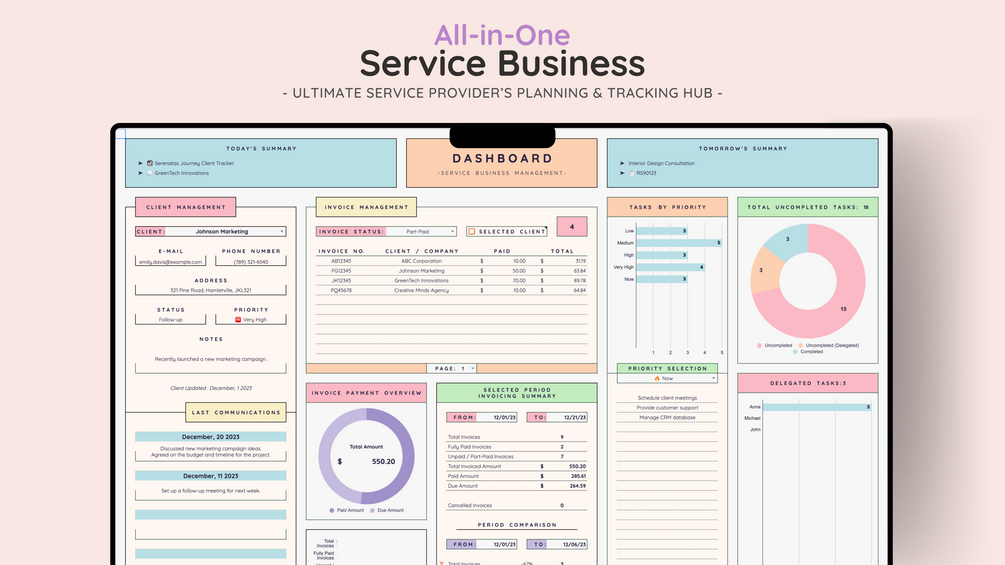 Take your service business to the next level with the All-in-One CRM and Bookkeeping Template for Google Sheets. This comprehensive tool combines client management, financial tracking, and task organization into one powerful solution. Perfect for small service businesses, it simplifies operations, strengthens client relationships, and boosts productivity.